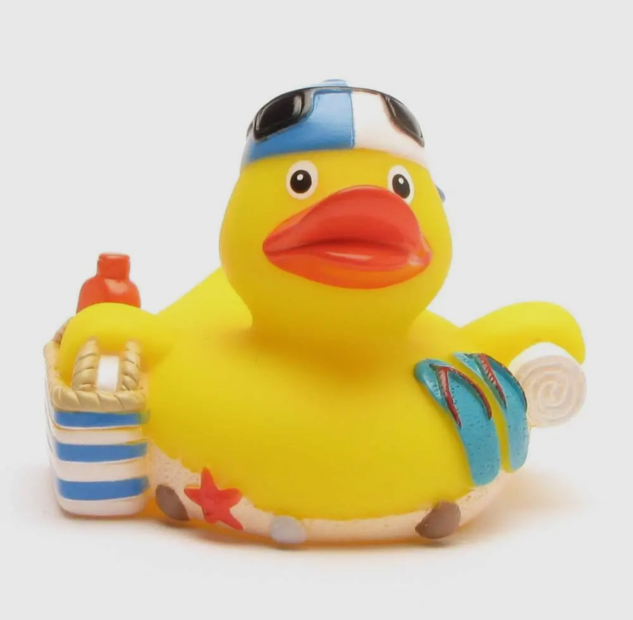 Beach Rubber Duck. She has everything with her. Flip-flops, towel and sunscreen.